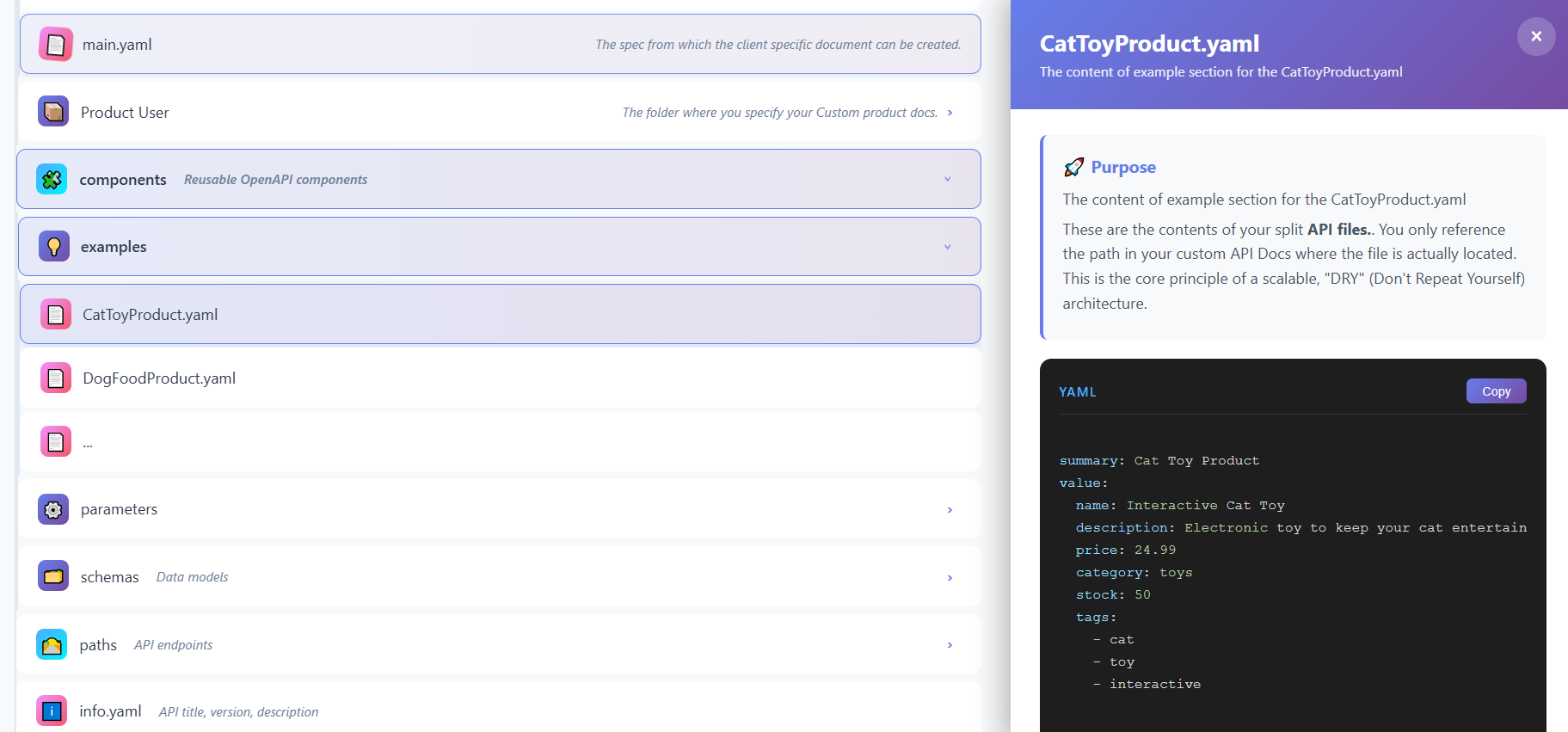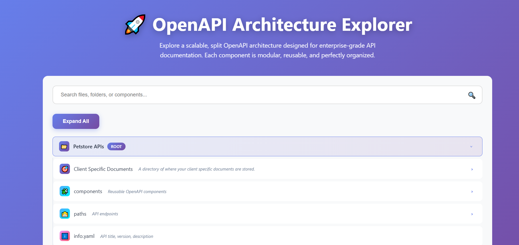 Traditional monolthic OpenAPI files becomes hard to maintain as API grows. Based on client requirements, you may have to customize your API endpoints. This explorer demonstrates how you can split specs into reusable components, making them: