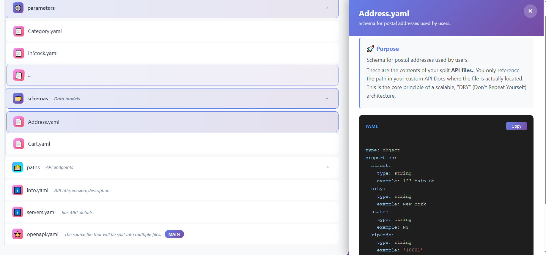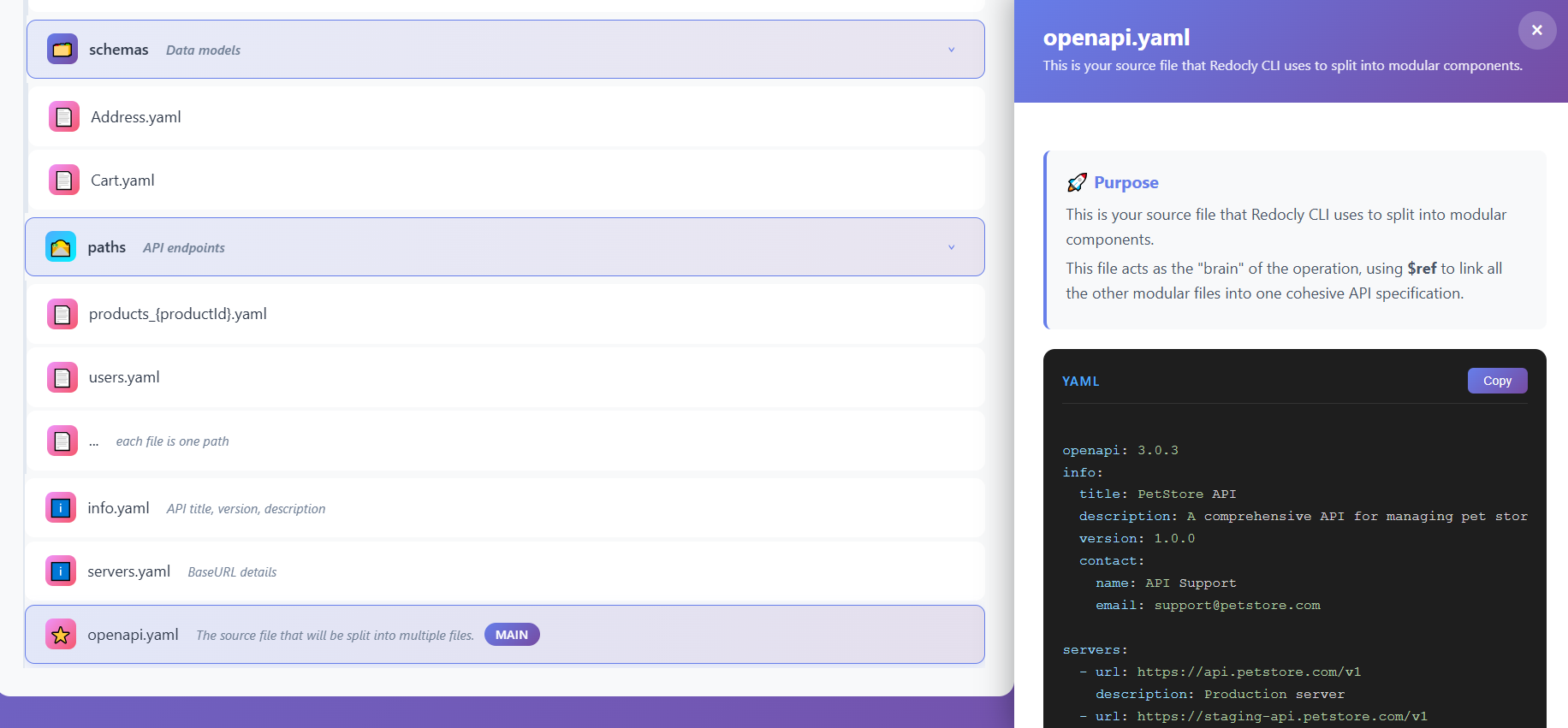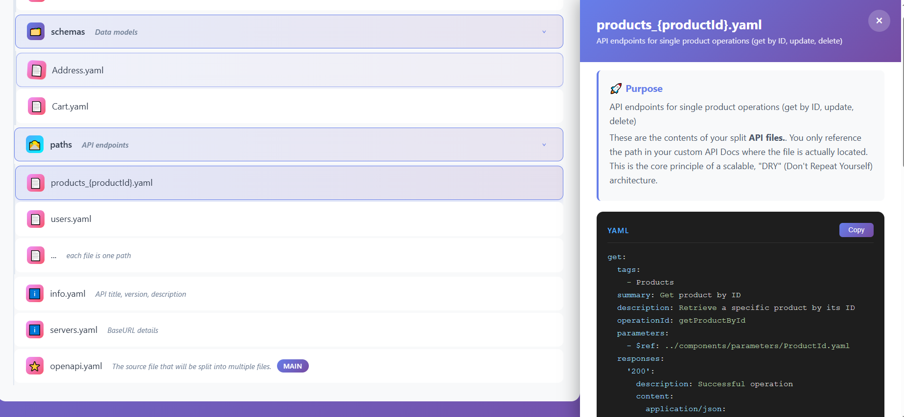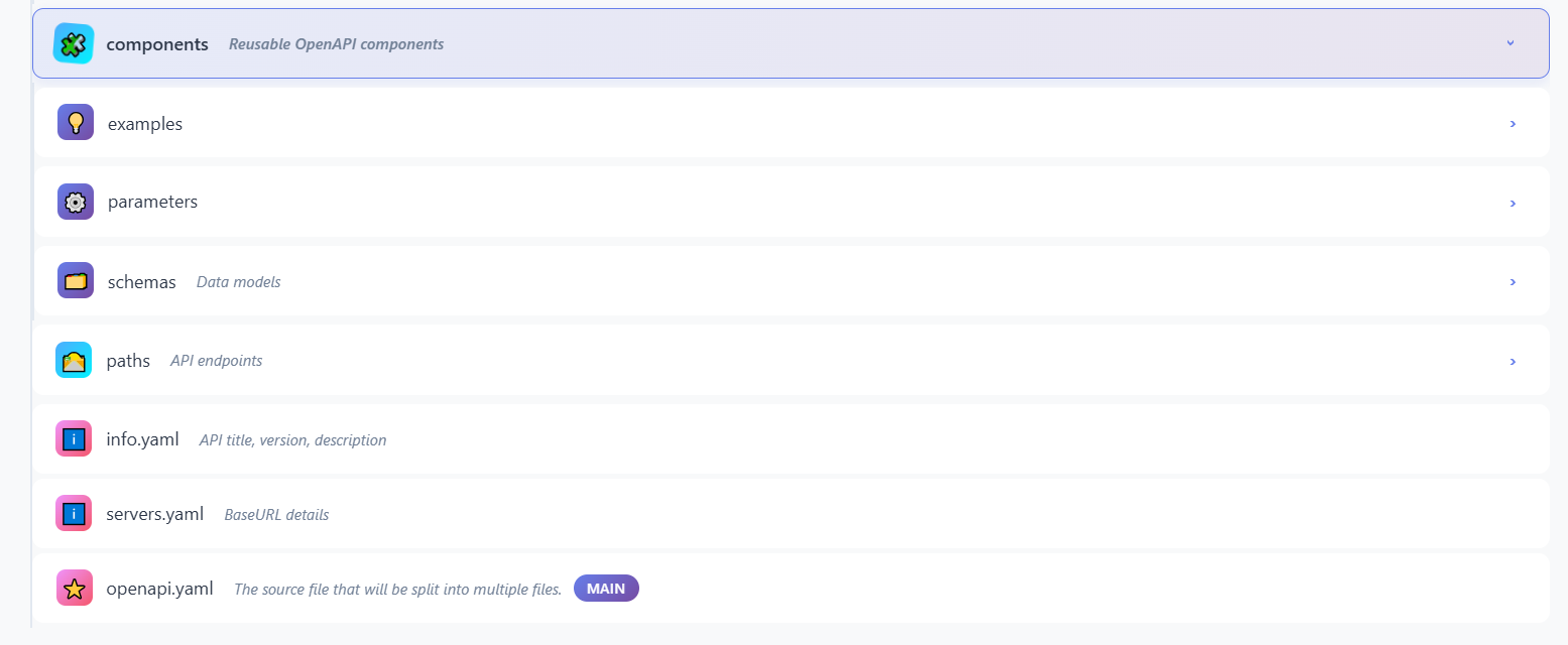 Use Case: This file is what API consumers, tools, and generators read. It dynamically combines all the modular files into a complete, valid OpenAPI specification. When you update any component file, the main file automatically reflects those changes through references.