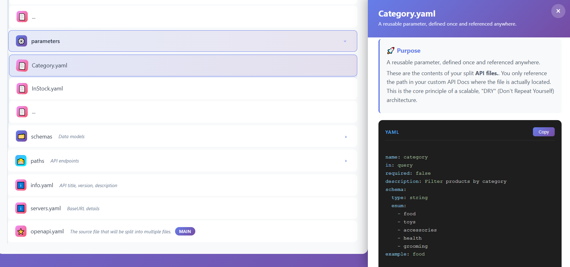 - Reusability: Share schemas, parameters, and examples across endpoints