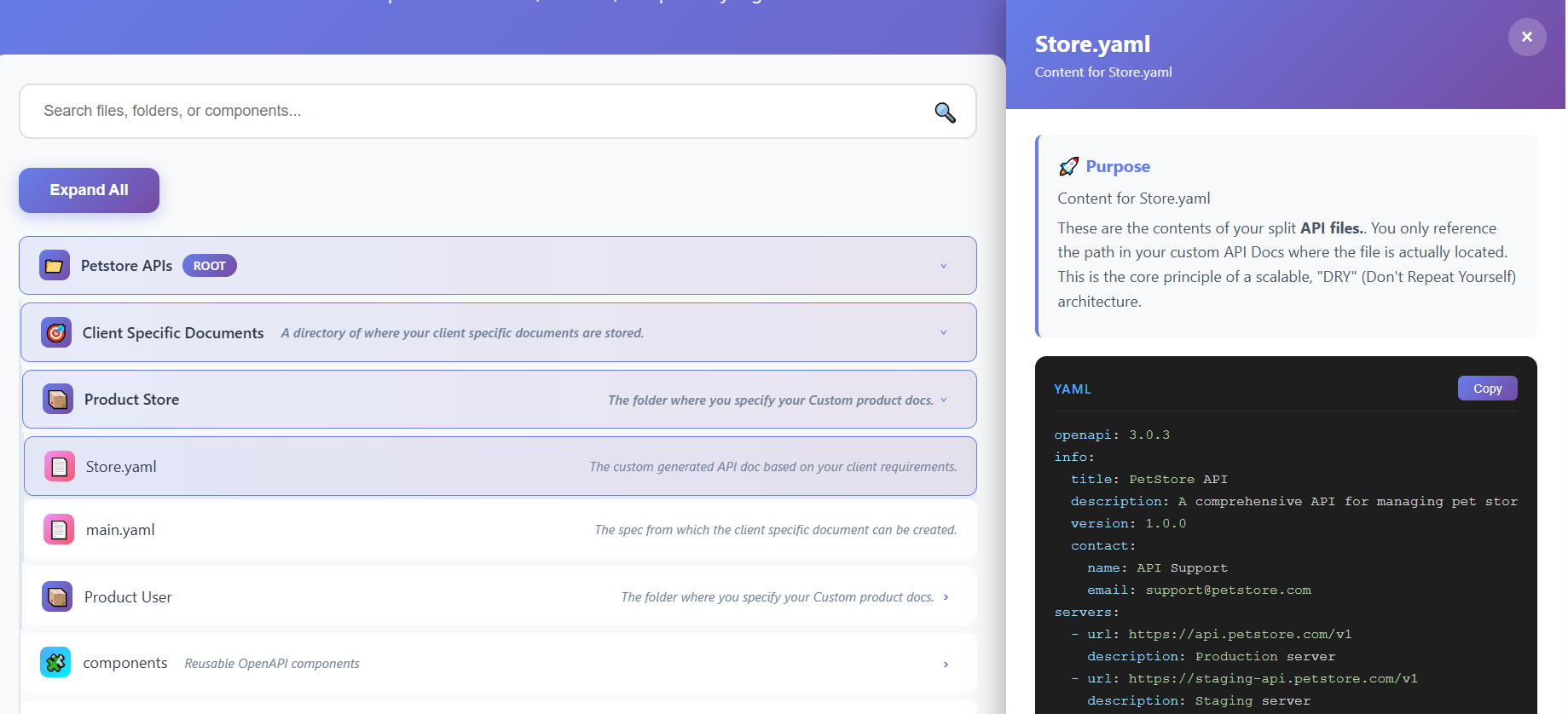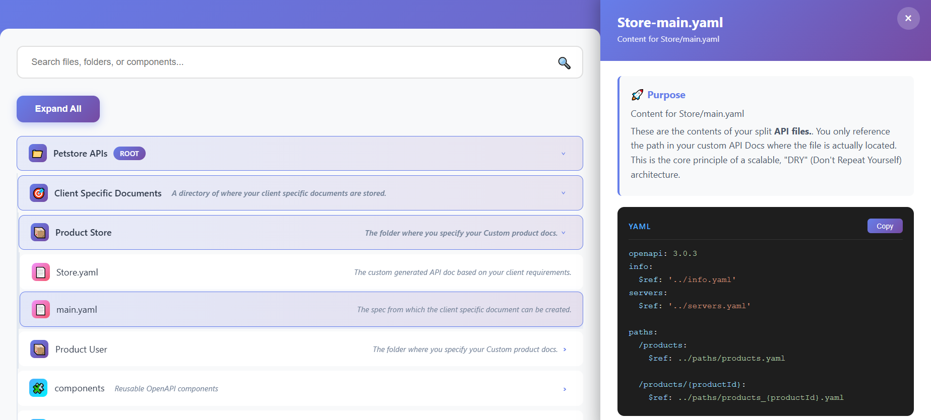Purpose: The Client Specific Documents is where client-specific customizations are organized. This is where you create .yaml files with only paths(endpoints) that are relevant to the client.