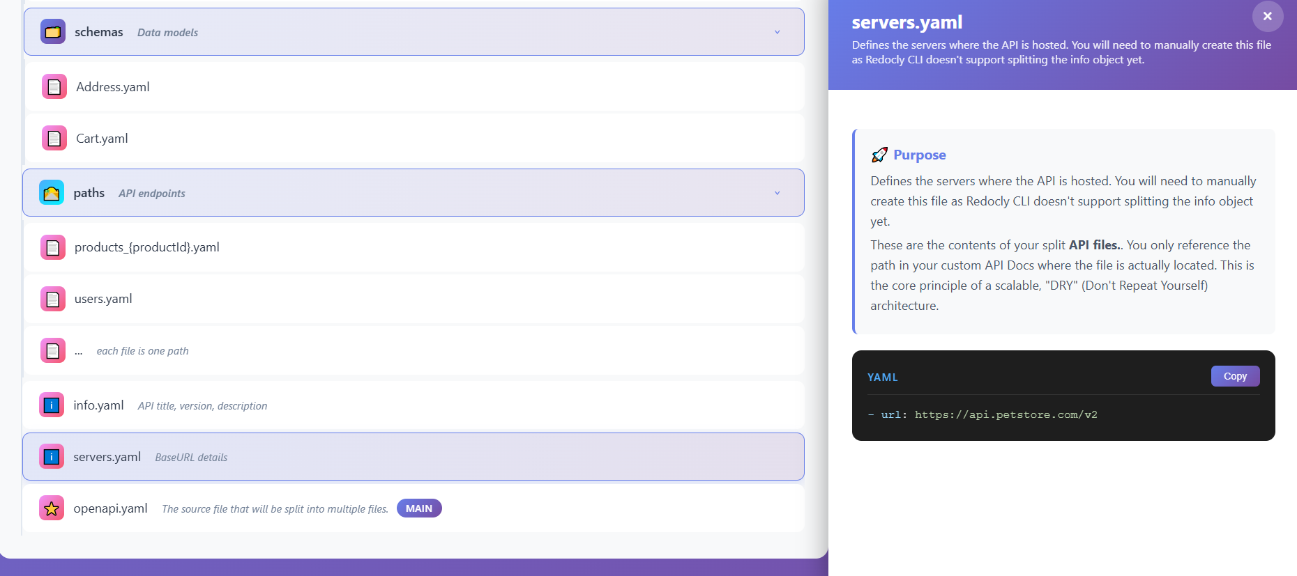 componentsdirectory using Redocly CLI’s split command. - Customize for products: Use the